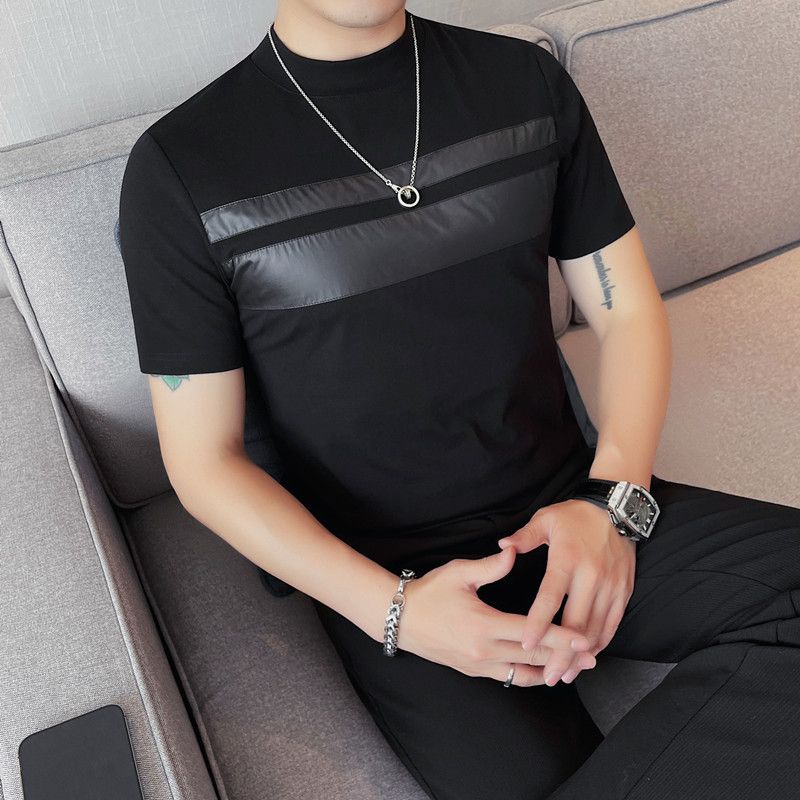 2024 Summer New Men's Short-sleeved T-shirt Chest Patch Contrasting Color Men's Elastic Half-sleeved Bottoming Shirt Round Neck Tide