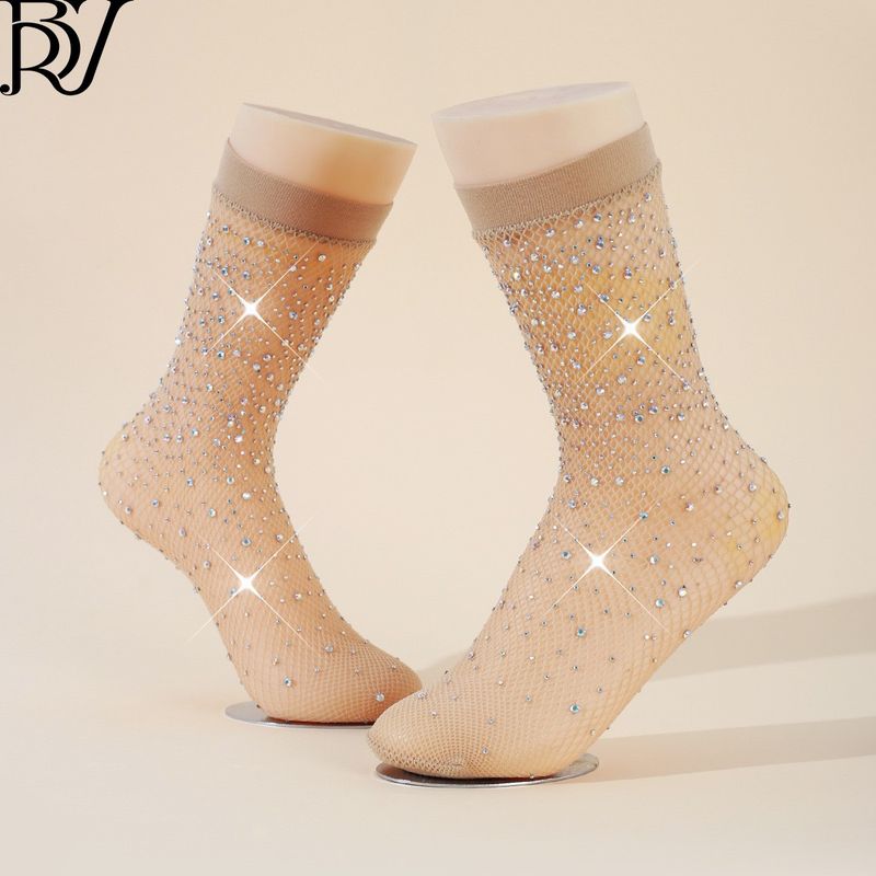 2025d Fashionable Rhinestone Short Fishnet Stockings For Women, Simple Solid Color Mid-Calf Mesh Socks