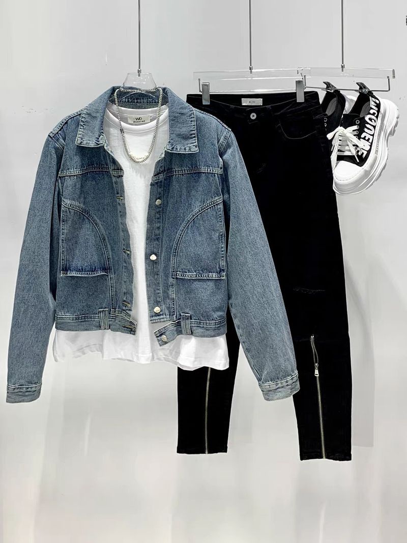 Hösttvättad herrdenim med tredimensionella fickor och trendig jacka_voghion.com