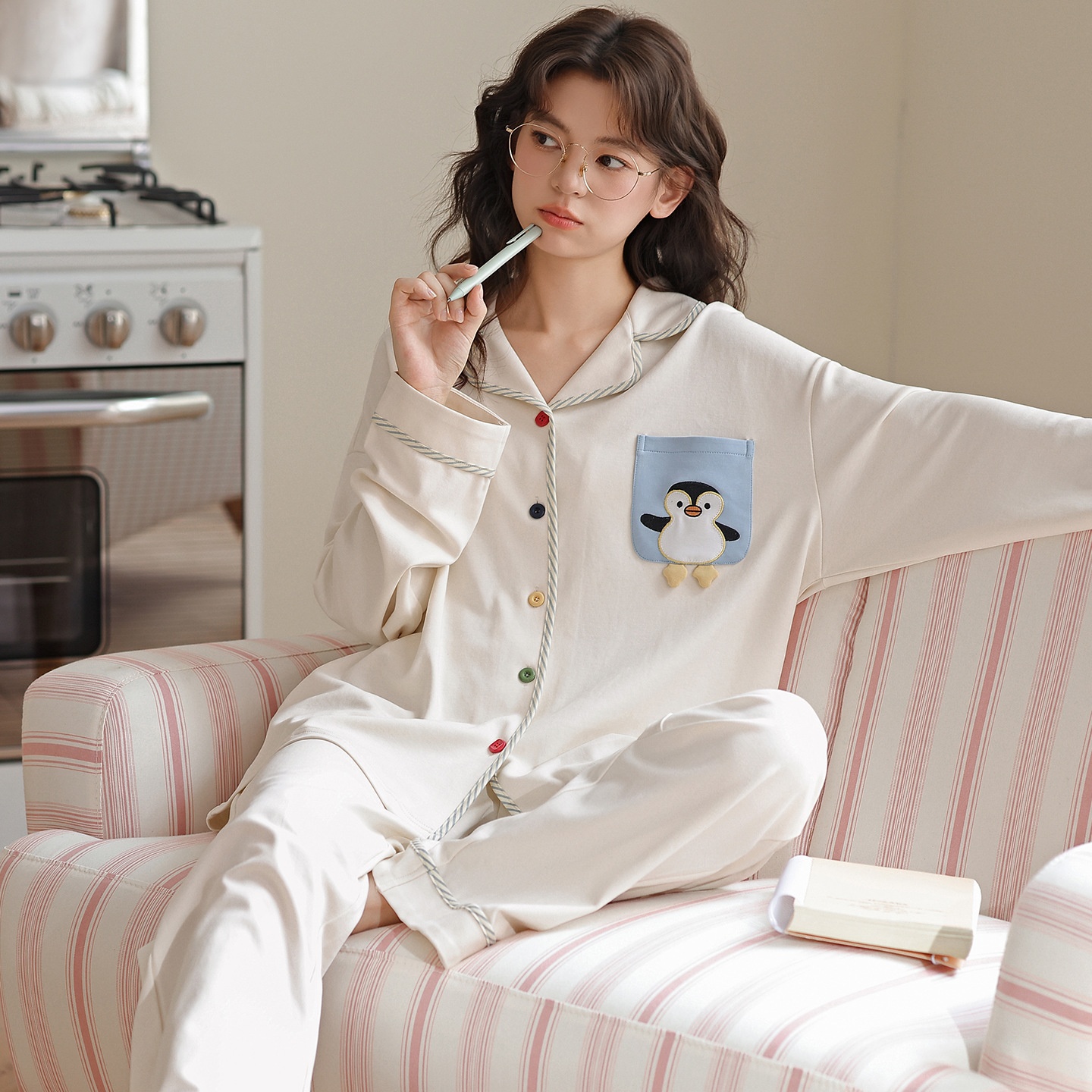 ChicShe 2025 New Cotton Pajamas For Women Spring And Autumn Long Sleeve Loose Striped Set Ladies Homewear Wearable Cartoon