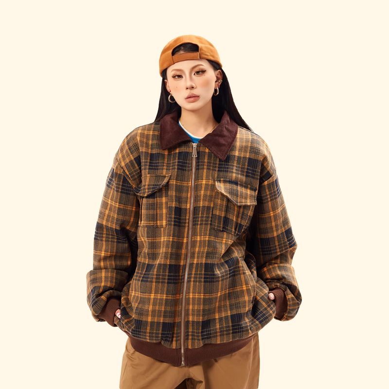 Color-Block Cotton Jacket American Style Versatile Plaid Thickened Cotton Coat Baseball Jacket Unisex Padded Couple Jacket Outerwear