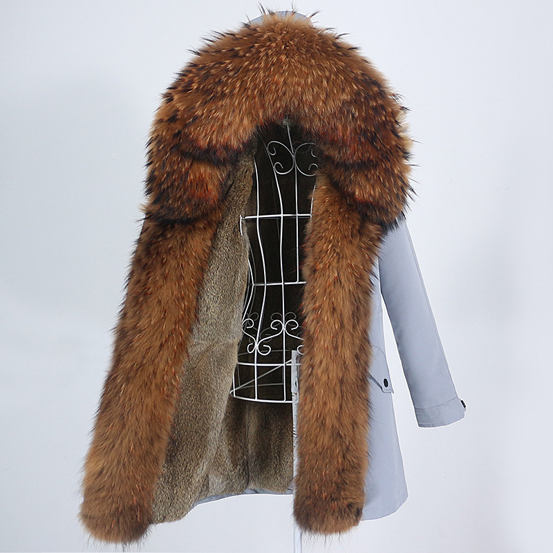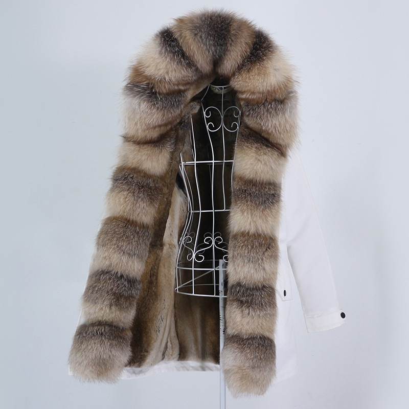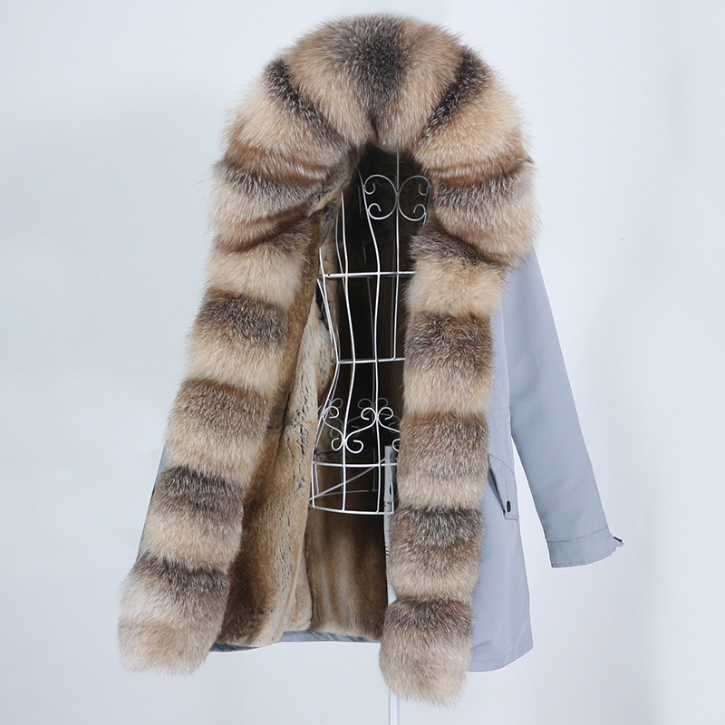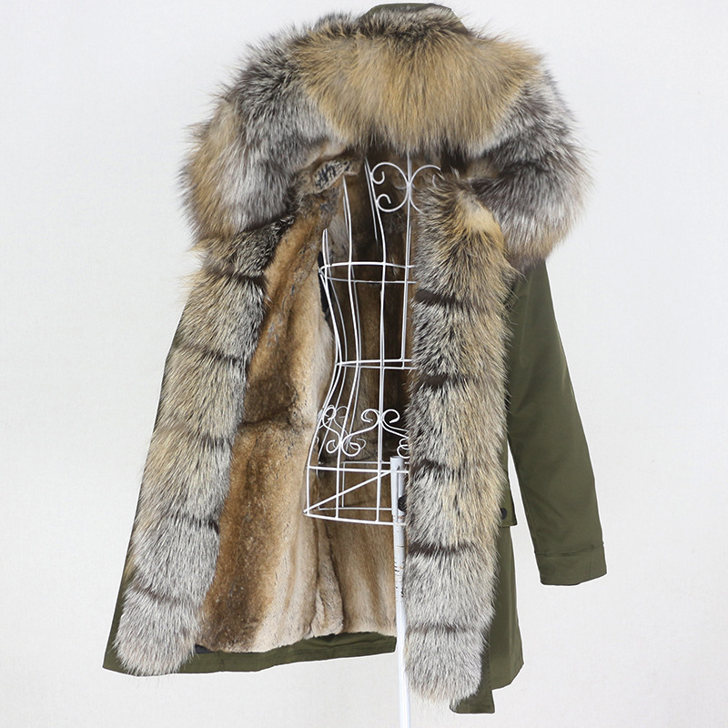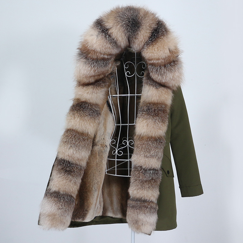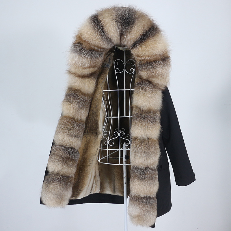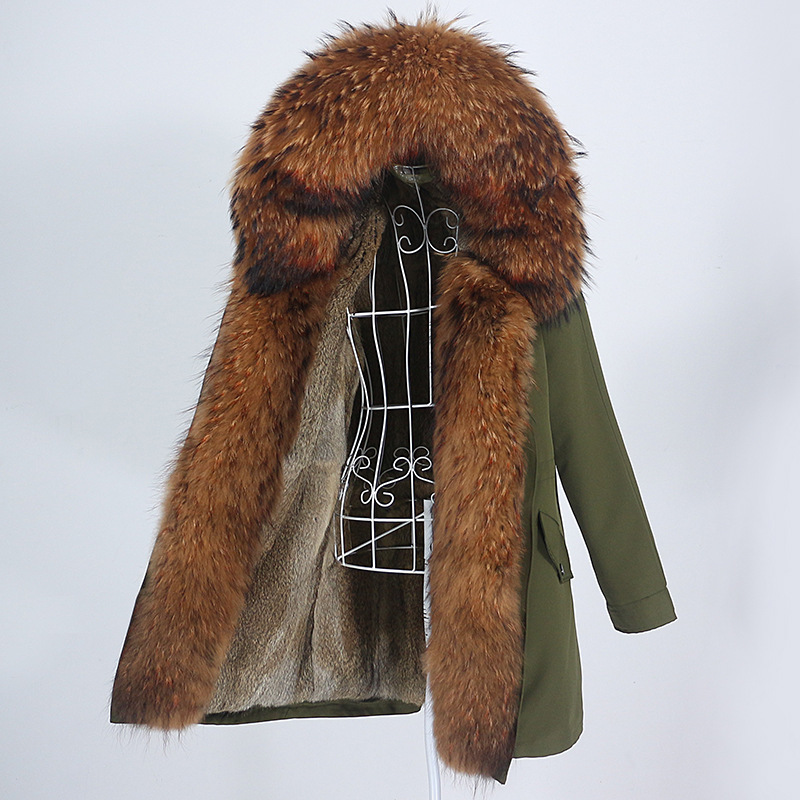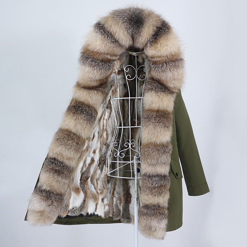 Damkläder hett säljande pälsparka dam avtagbar fodrad pälskrage med mellanlång modern varm kappa med huva