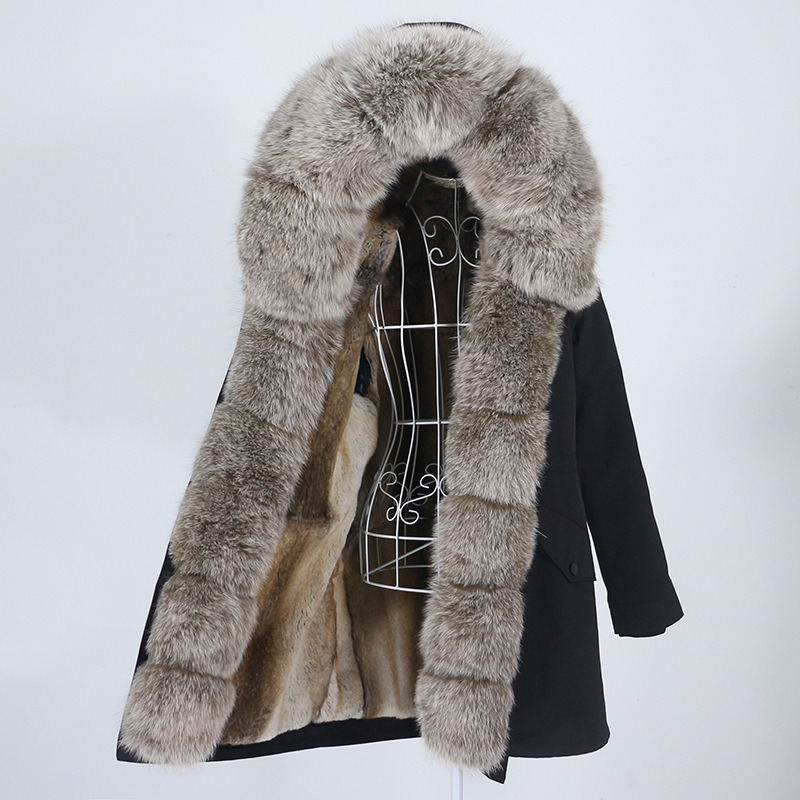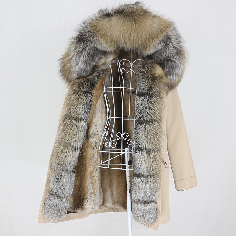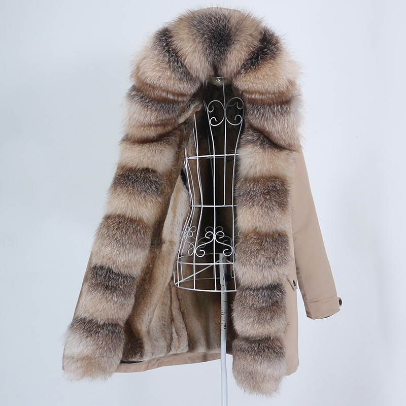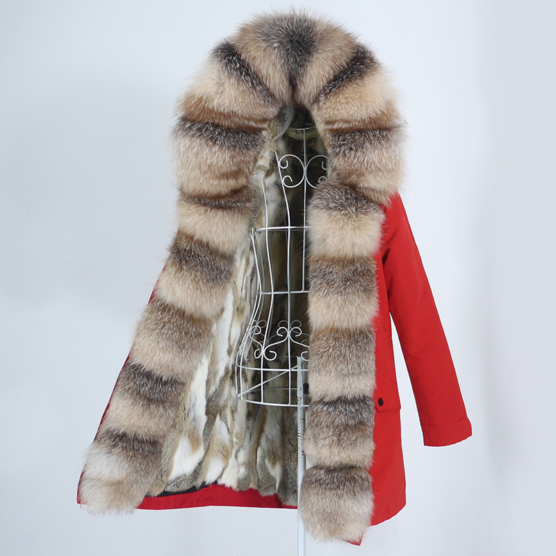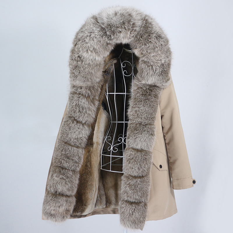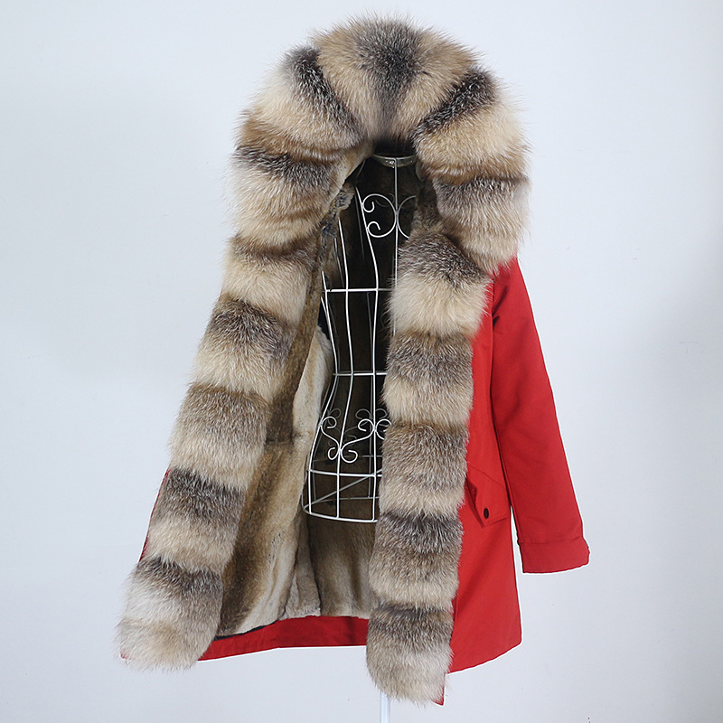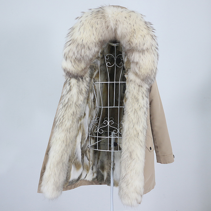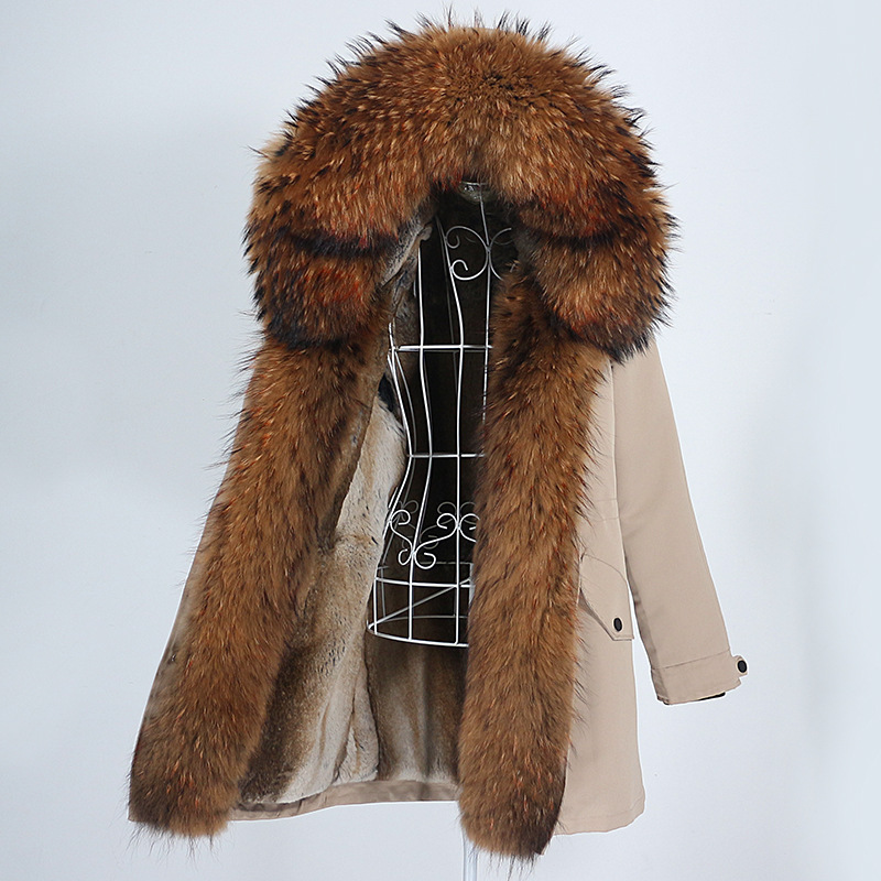 Damkläder hett säljande pälsparka dam avtagbar fodrad pälskrage med mellanlång modern varm kappa med huva