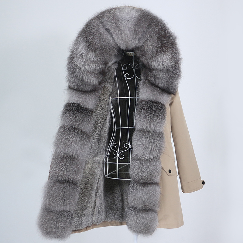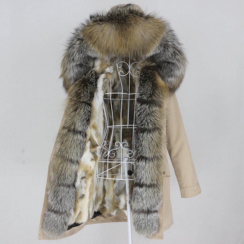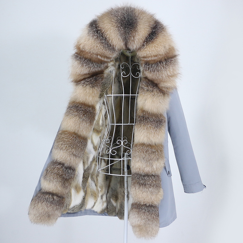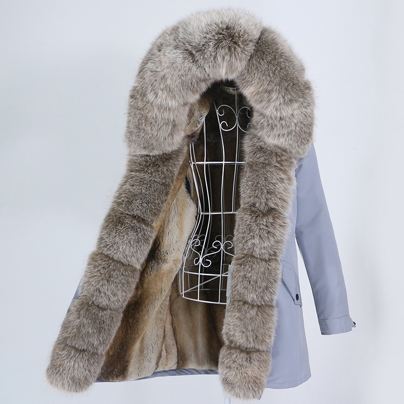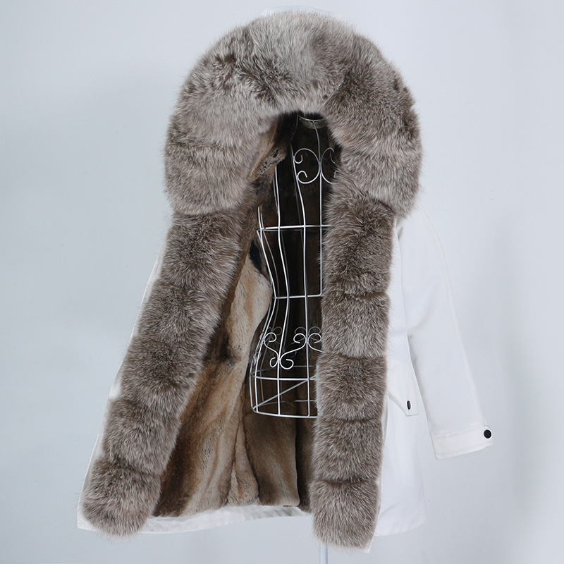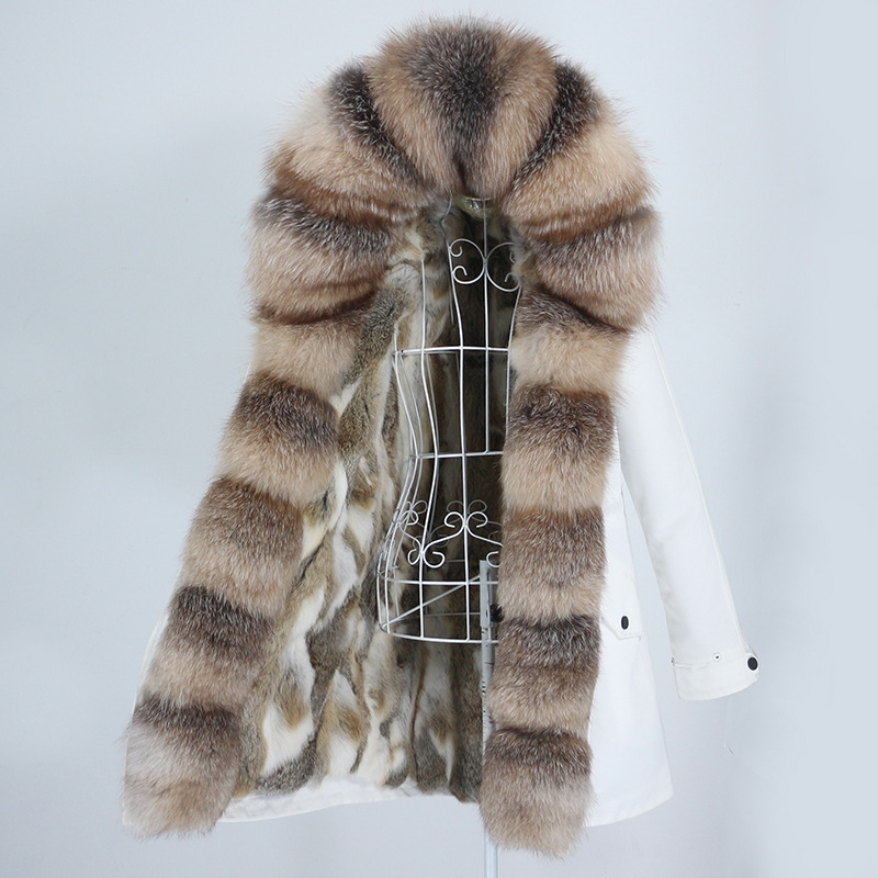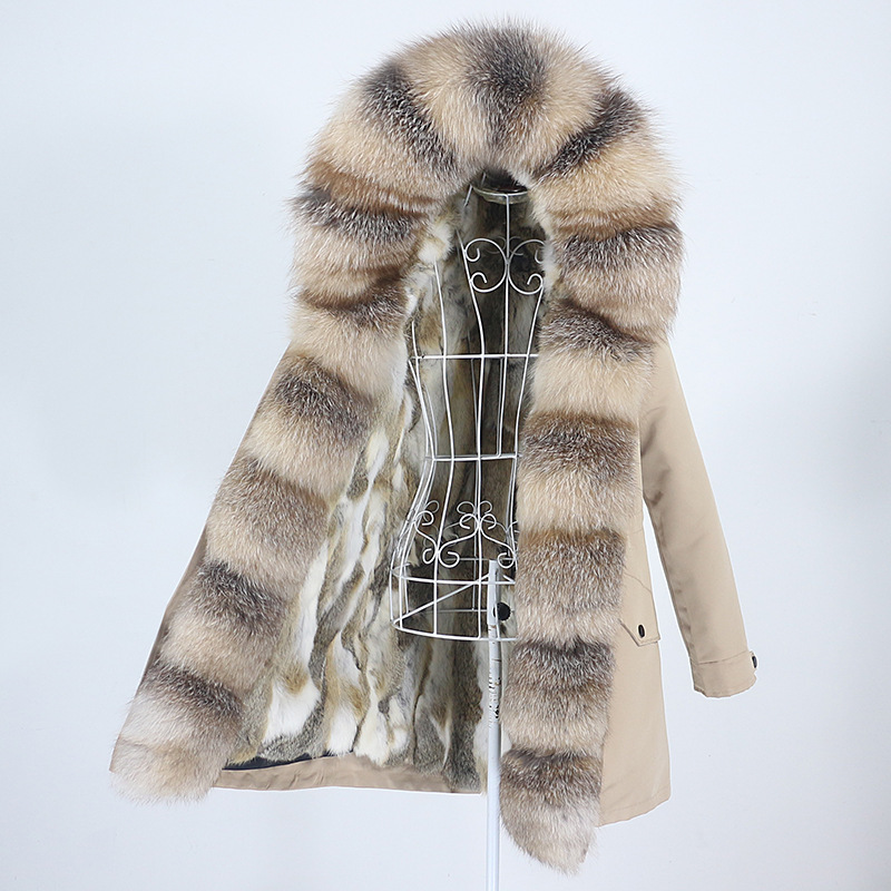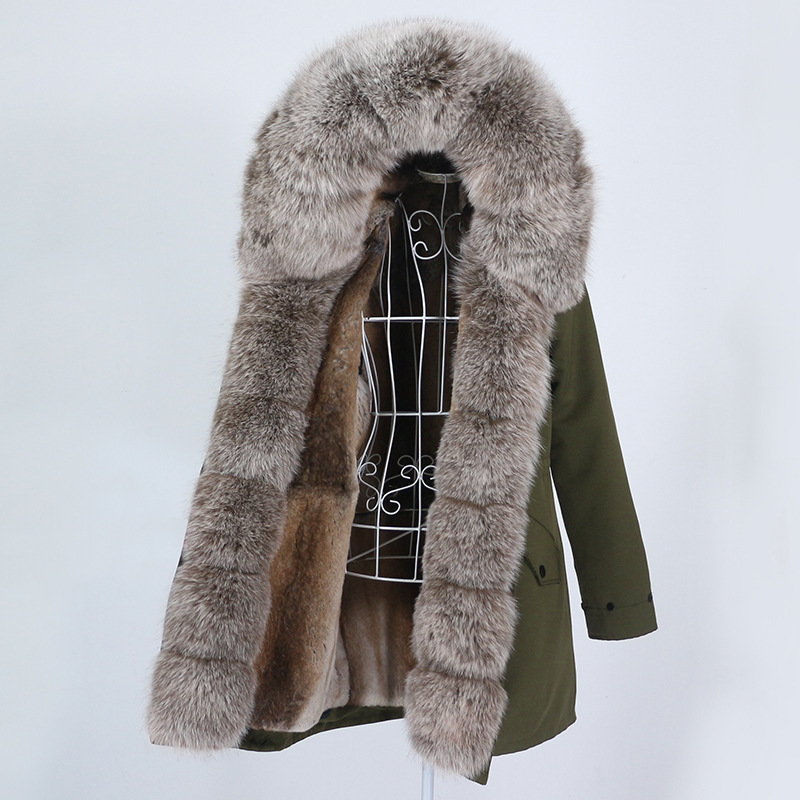 Damkläder hett säljande pälsparka dam avtagbar fodrad pälskrage med mellanlång modern varm kappa med huva