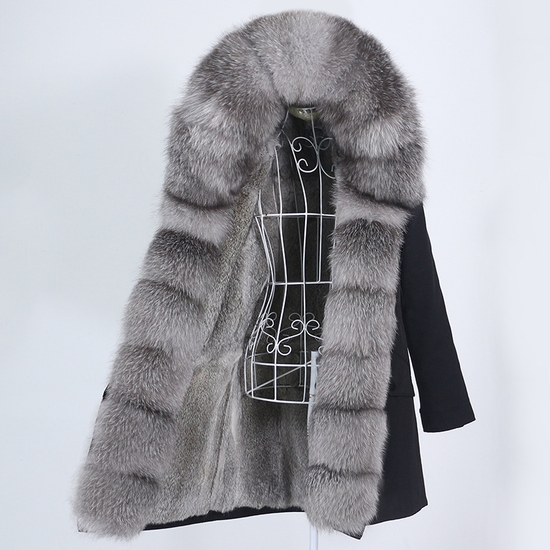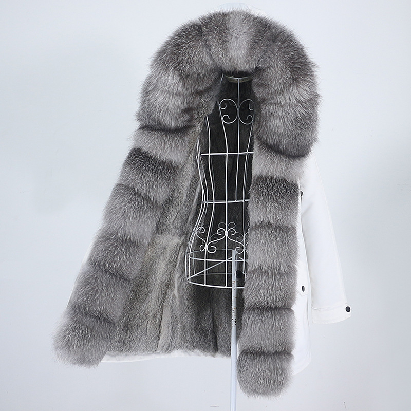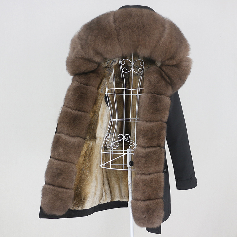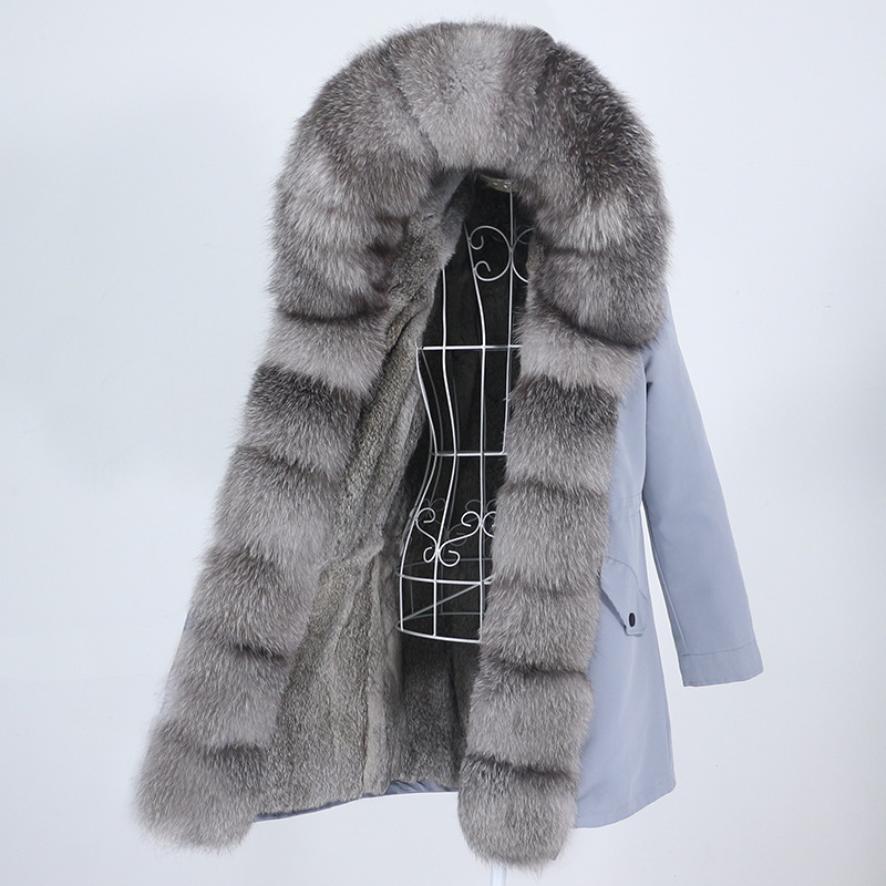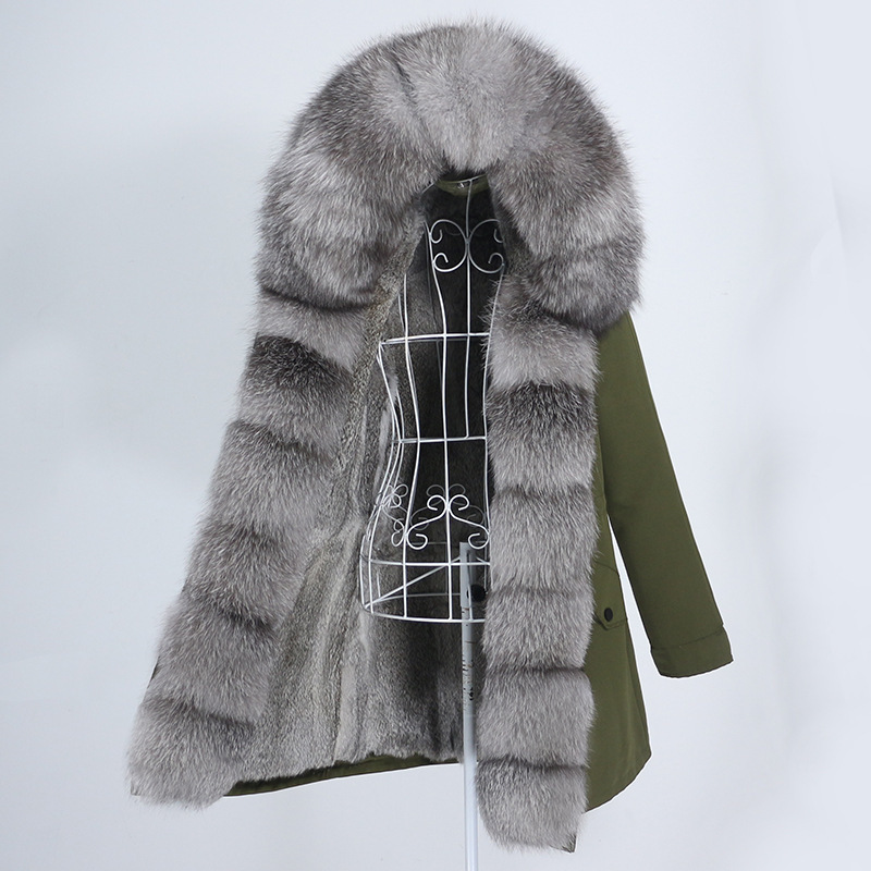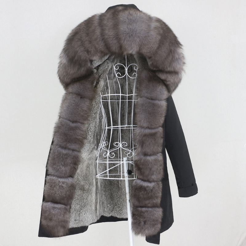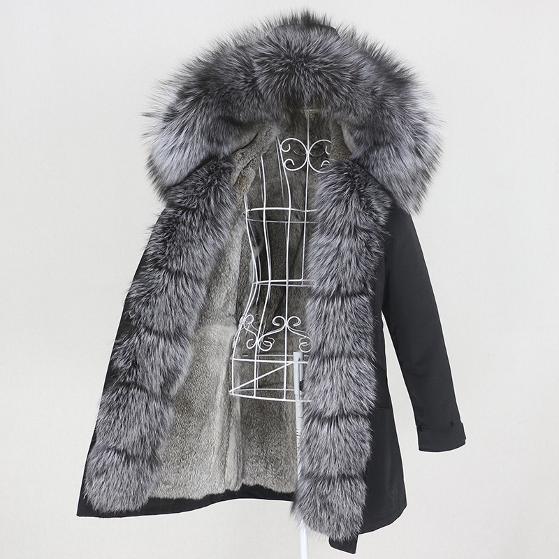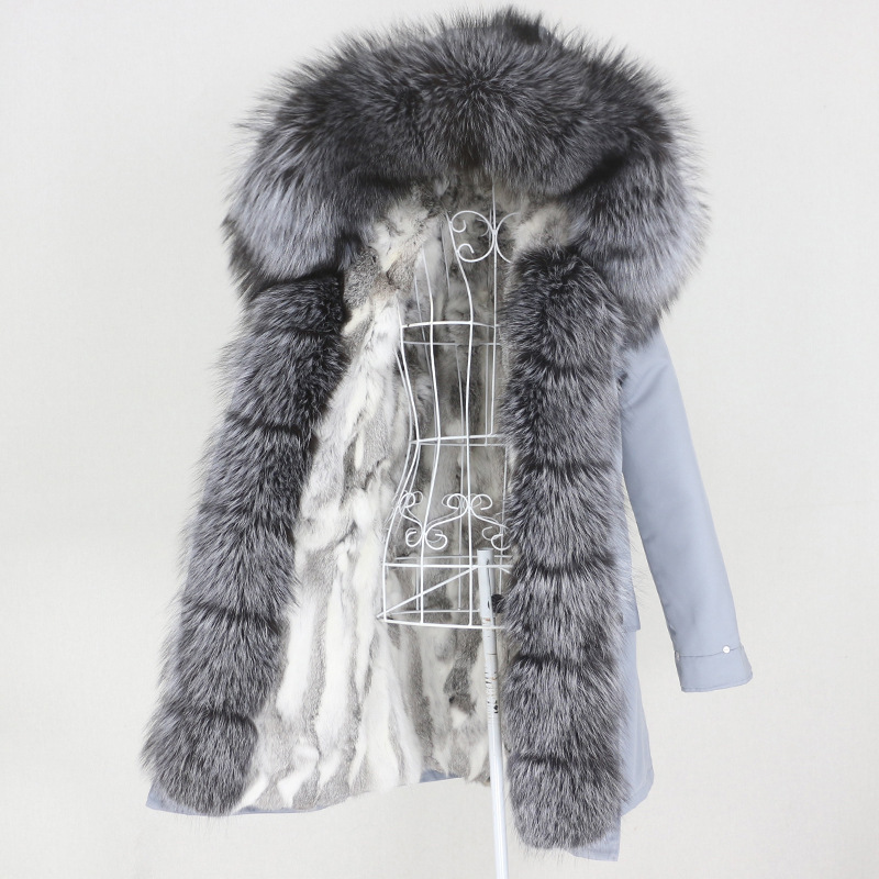 Damkläder hett säljande pälsparka dam avtagbar fodrad pälskrage med mellanlång modern varm kappa med huva