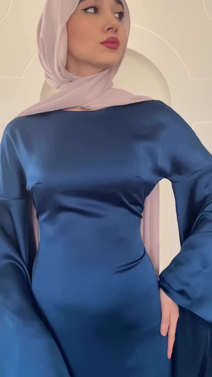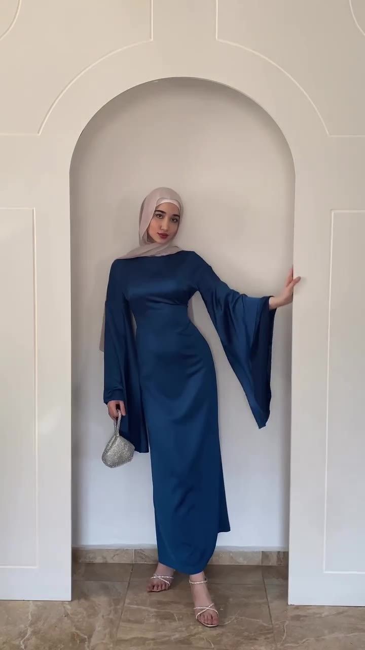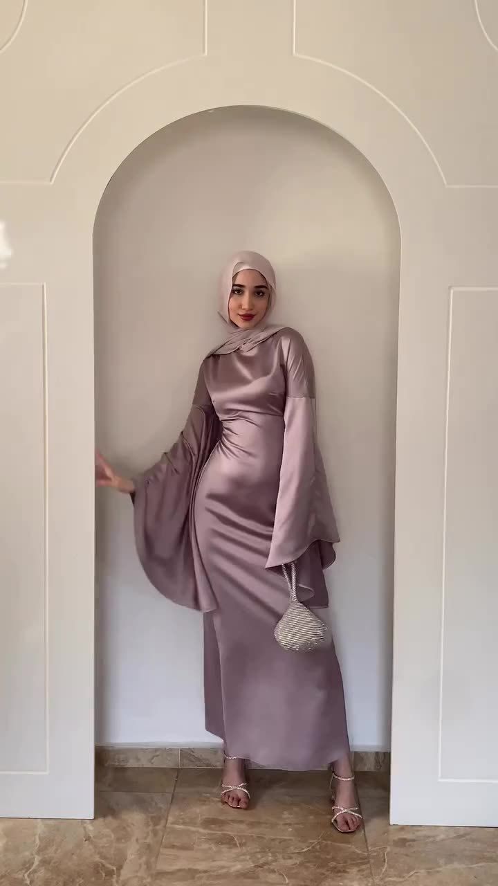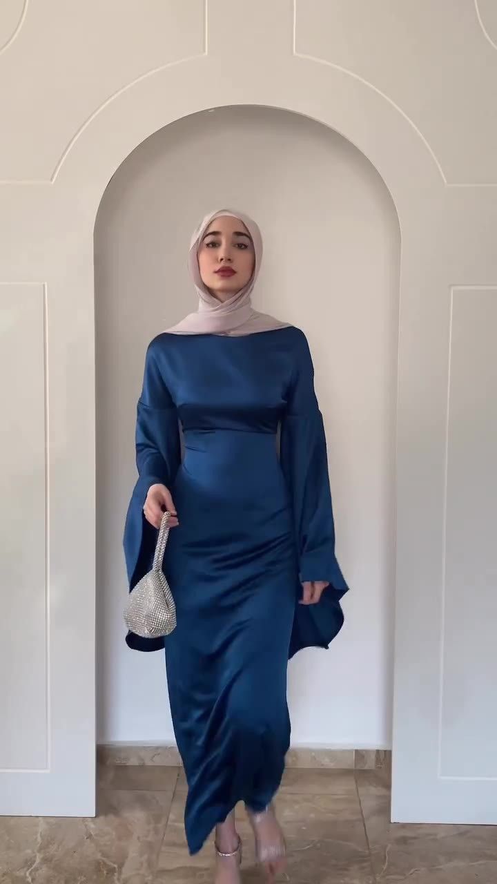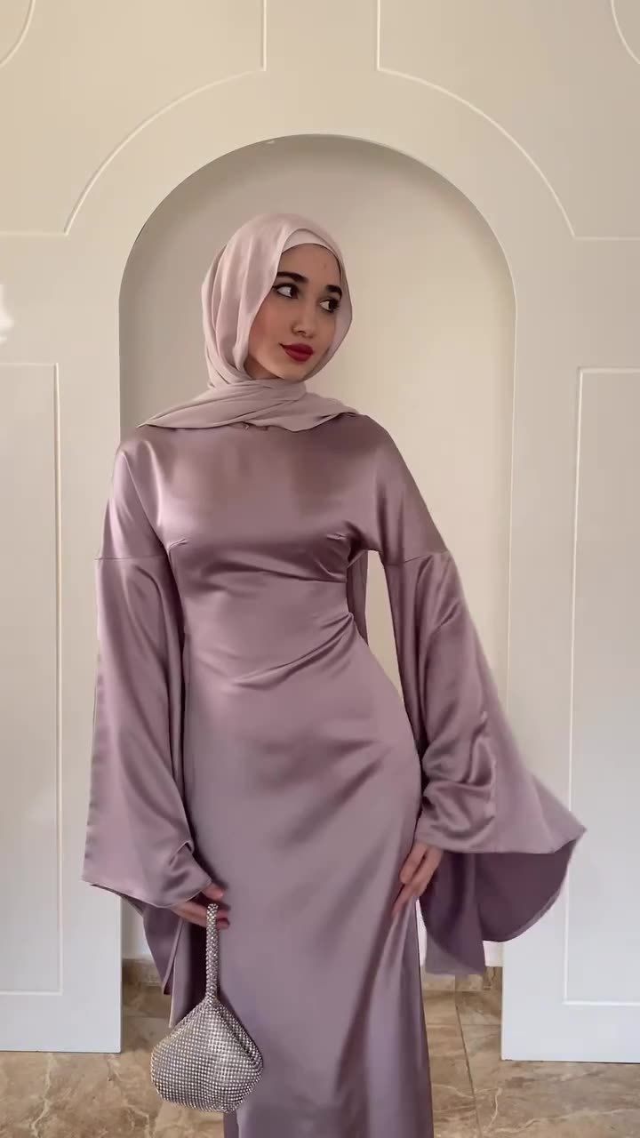 Damkläder 2024 våren nya midja smal satin trumpet ärm enfärgad temperament klänning för kvinnor