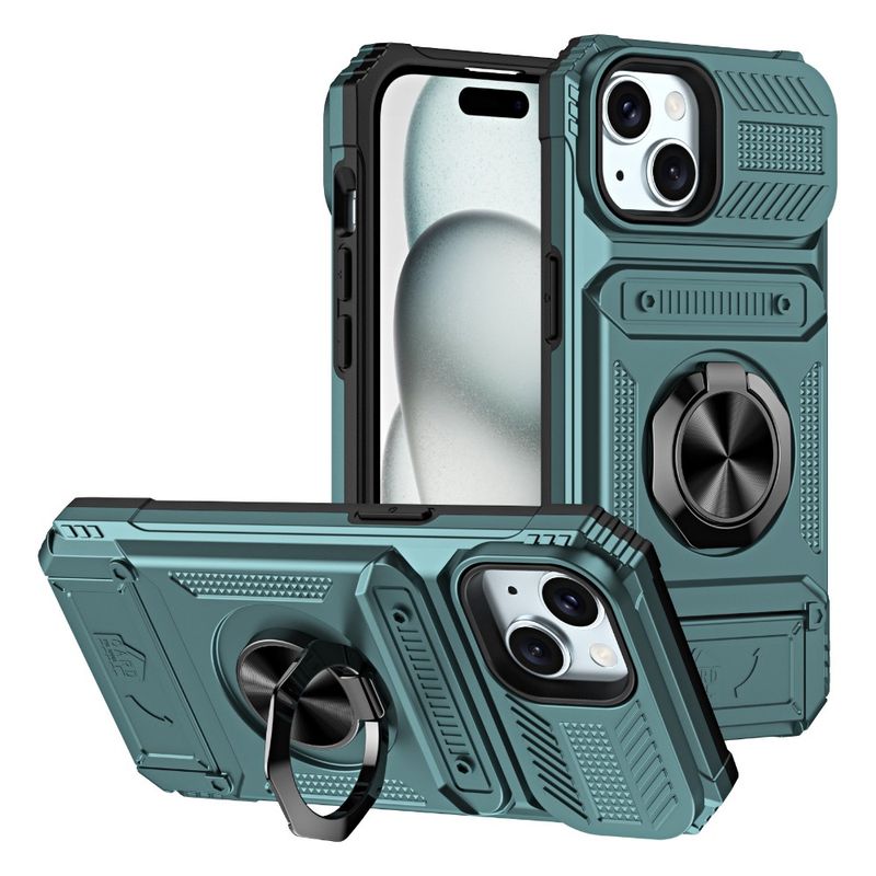 För iPhone 15 14 Plus 13 Pro Max Plånboksfodral med Ring Stativ Korthållare Hårdplast + Mjuk TPU