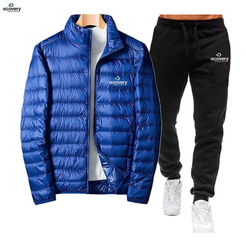 Men's standing collar cotton jacket long pants set, winter thick warm cotton jacket, white duck down jacket, casual two-piece cash out