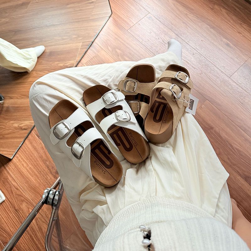 Lancui Toast Women's Summer New Soft Leather Thick Sole Slip-On Sandals Beach One-Strap Outdoor Slides