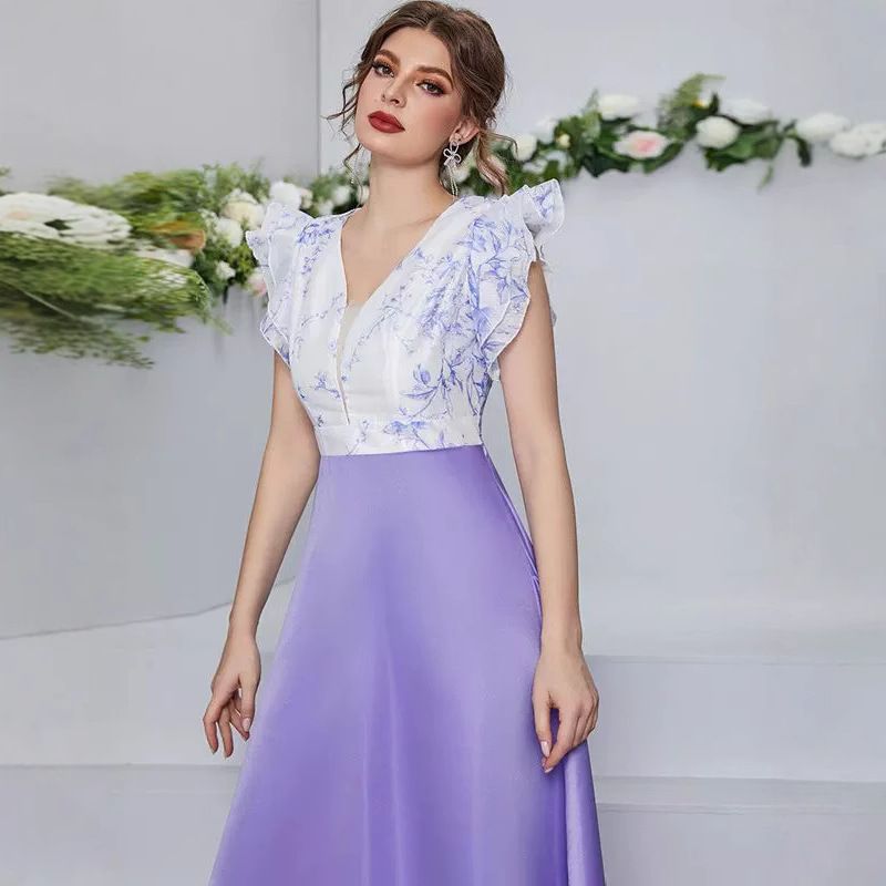 2025 Women's Spring and Summer New Sexy V-neck Petal Sleeve Digital Printed Dress