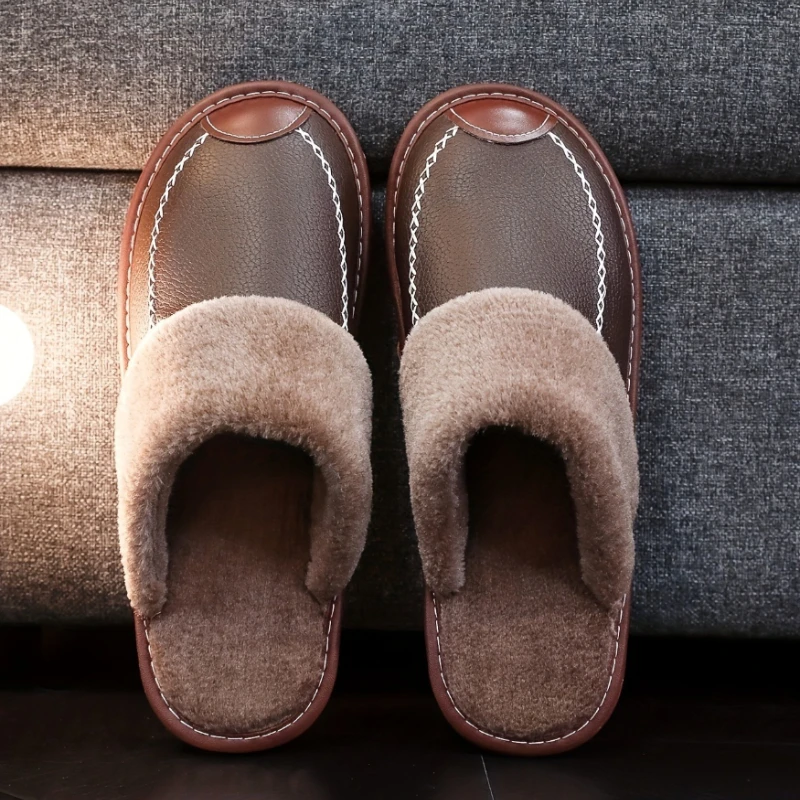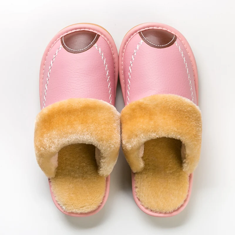Men Winter Leather Slippers Bedroom Cotton Slippers Male Waterproof Thick Plus Velvet Indoor Warm House Home Slippers Shoes