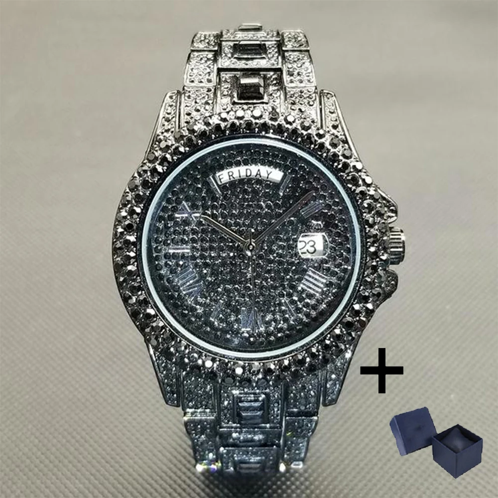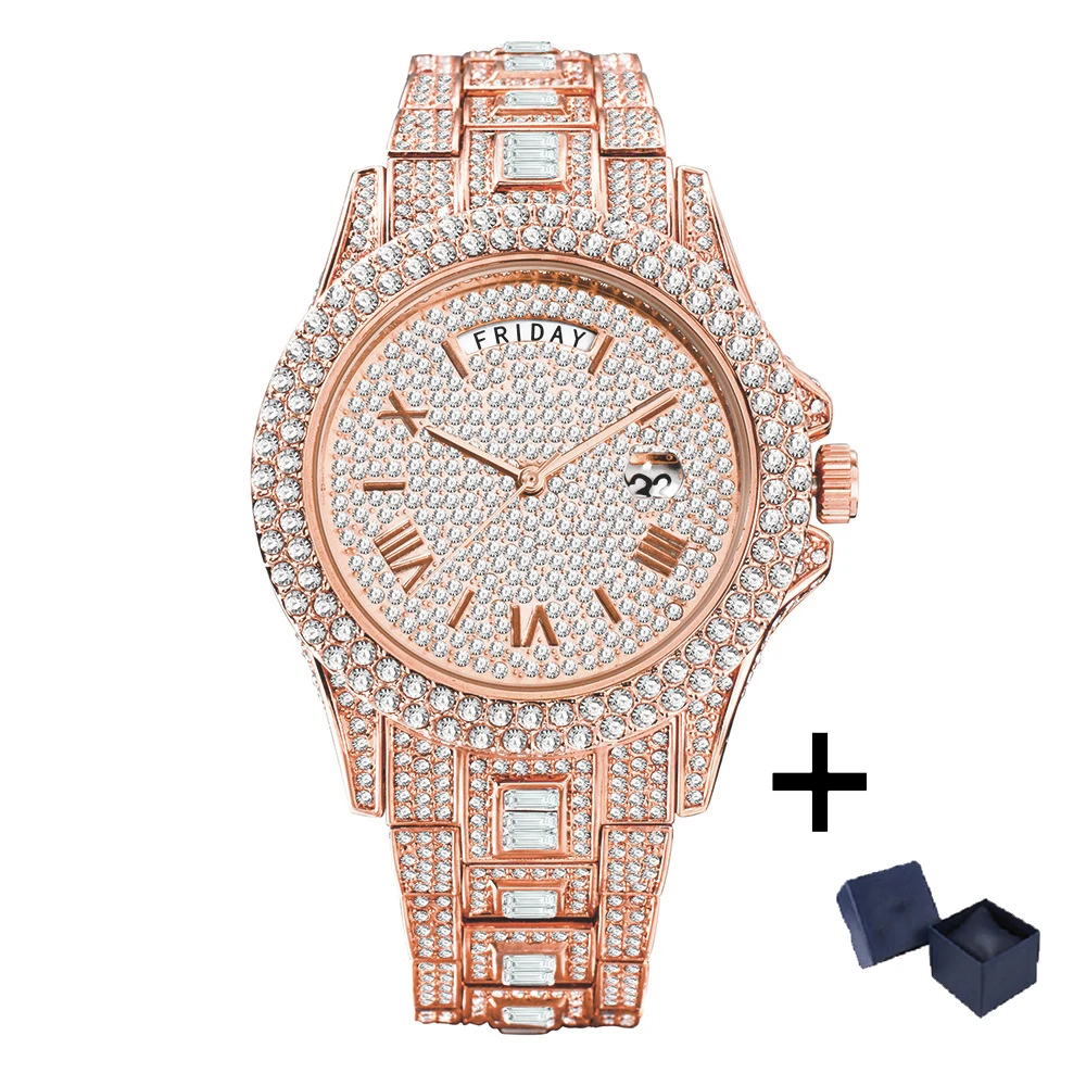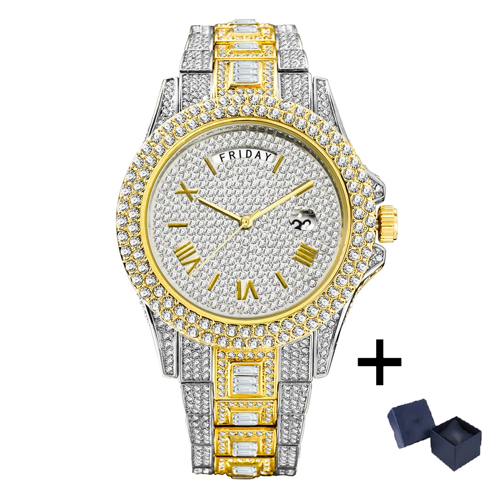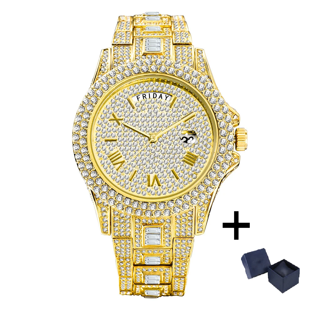 MISSFOX Guldklocka för män Mode Hip Hop Iced Diamond Automatisk kalendervecka Vattentät Quartz Armbandsur Man Reloj