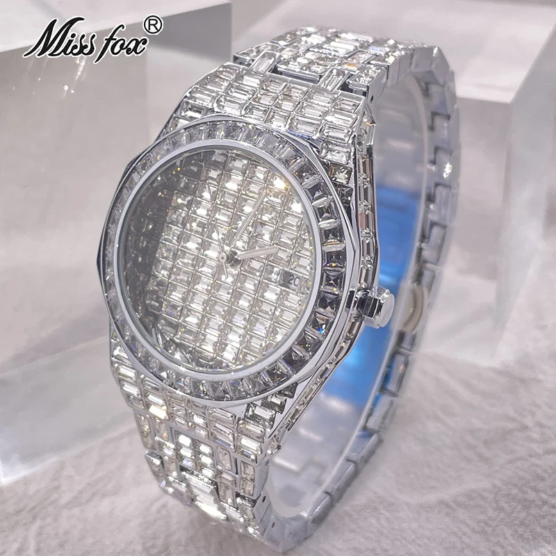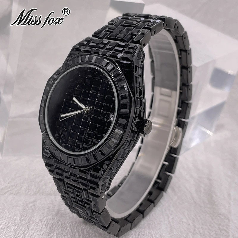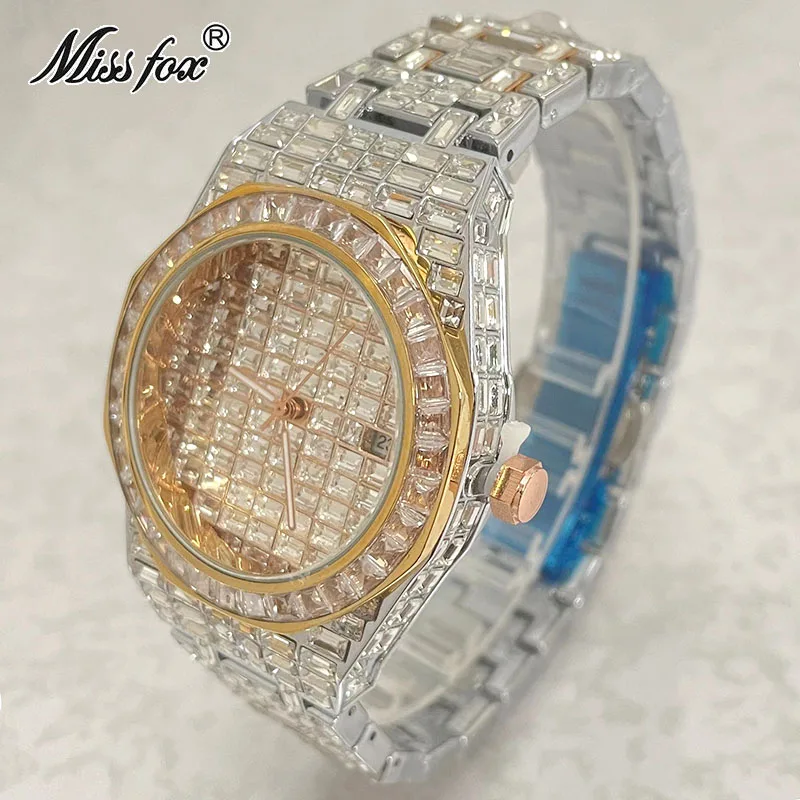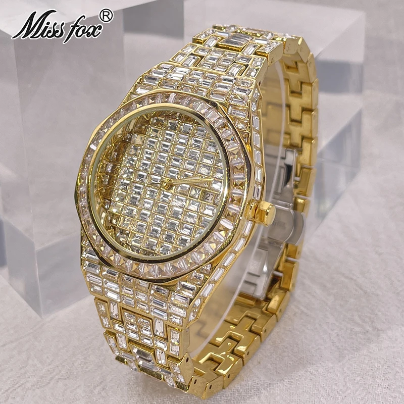 MISSFOX Iced Klockor Mode Herr Automatisk Date Vattentät Quartz Klockor Hip Hop Full Diamond Guld Armbandsur Rolej