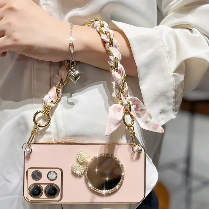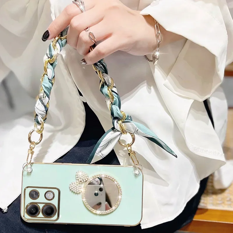 Silk Lanyard Armband Armband Fodral För Redmi Note 13 Plus 12 12S 12C 11 11S 10 10S 9 9S 9A 9C Pro Bow Mirror Plätering