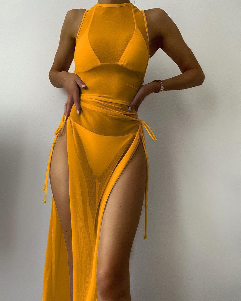 Ny enfärgad lång kjol Delad badkläder Solskyddsmedel Bikini strandkjol Tredelad badkläder för kvinnor