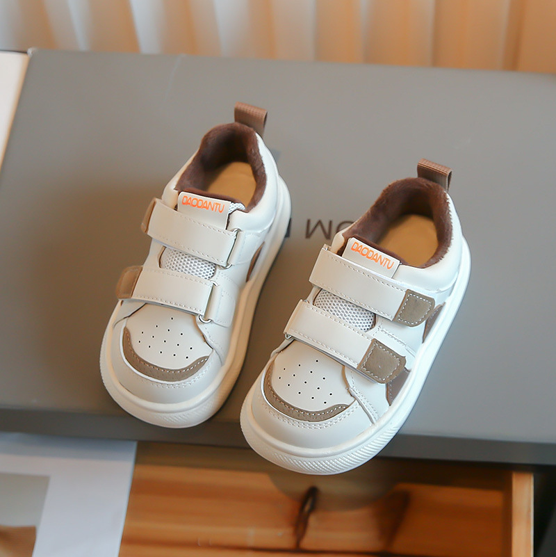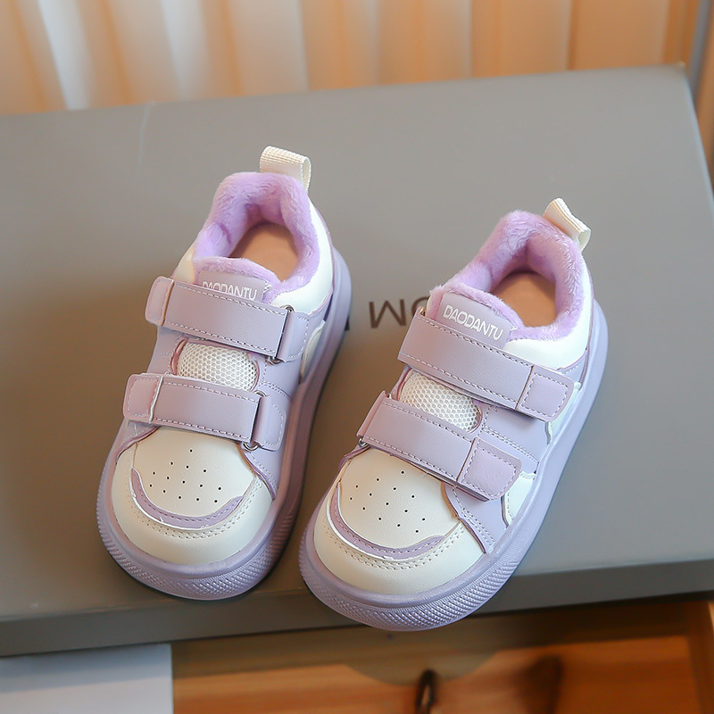 Plyschiga sportbrädeskor för flickor, 2023 höst och vinter nya pojkar, bebisar, flickor, lågskurna casual vita