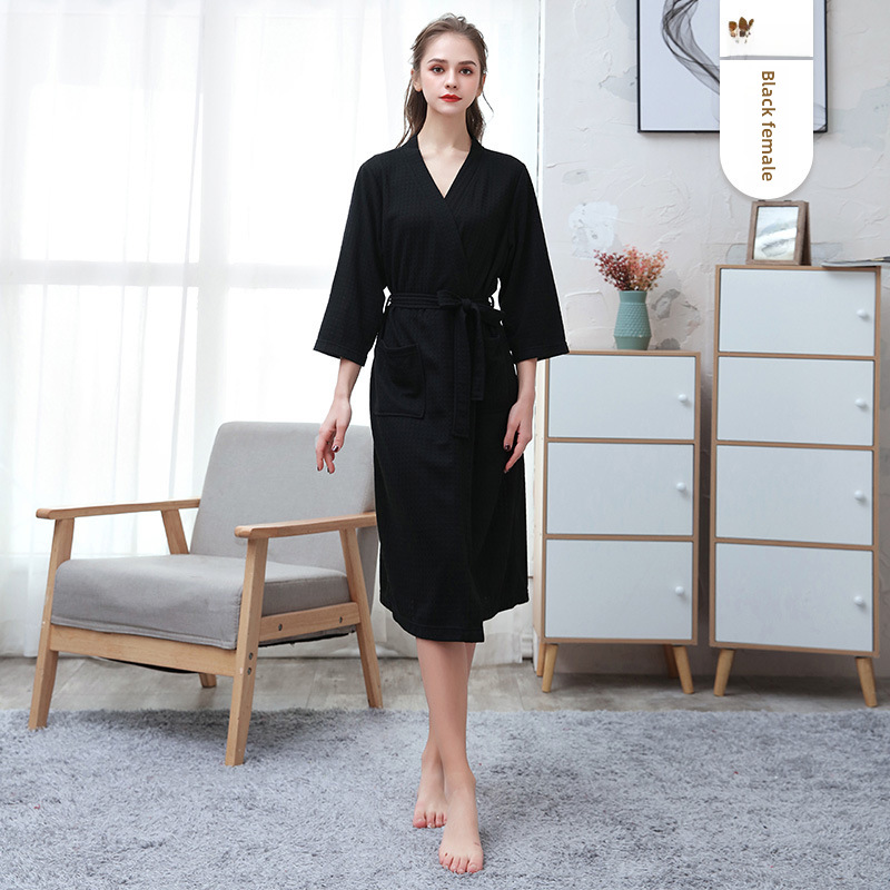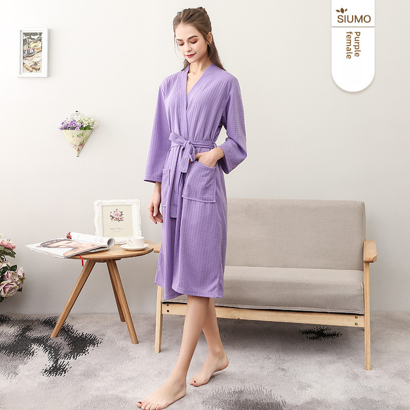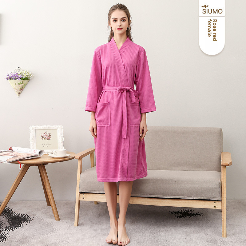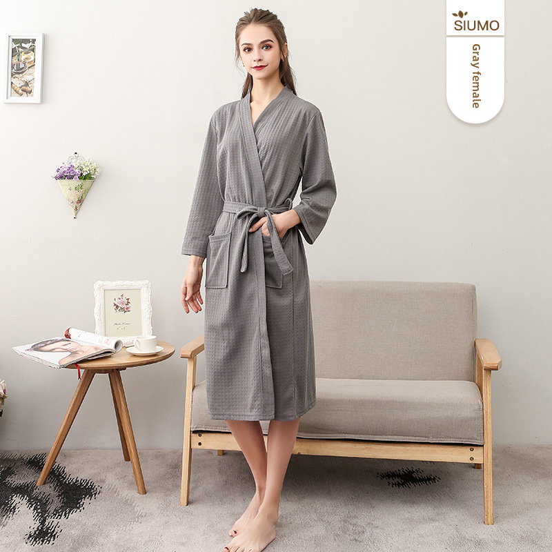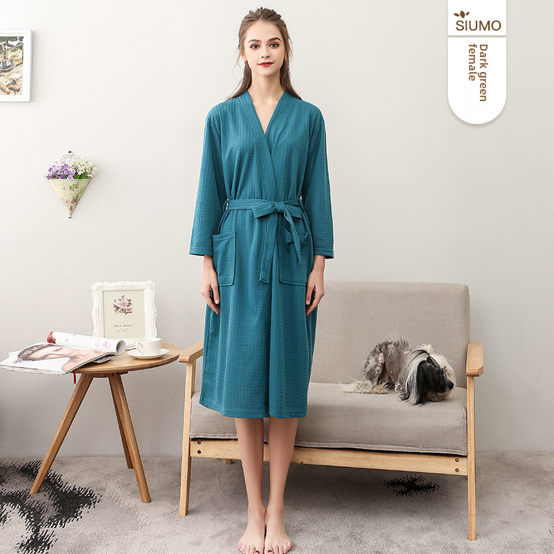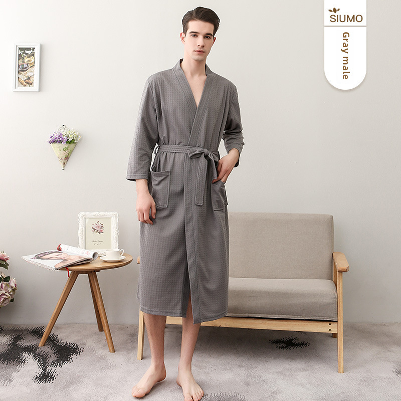 Sensommar Tunn Våffelbadrock Dam Enkel V-ringad Sjupunktsärm Absorberande ärm Nattlinne för par Vår och höst Herr
