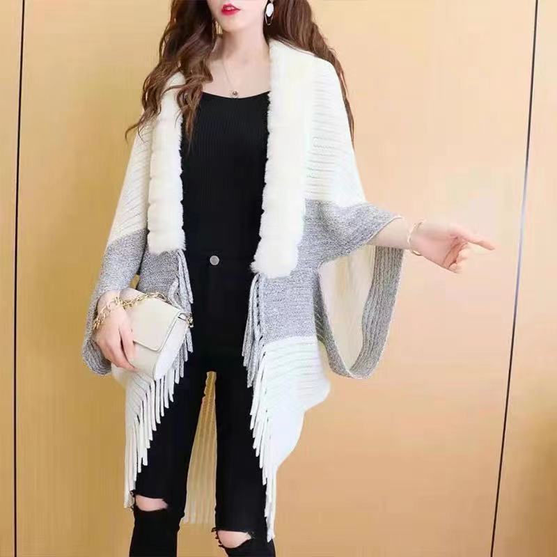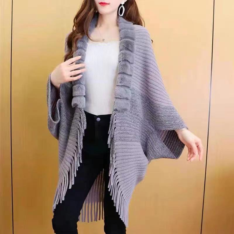 Lös pälskrage fransar stickad sjal cape stor storlek kofta cape kappa kvinna