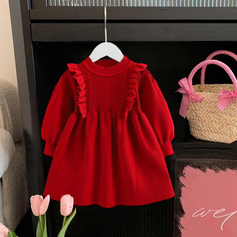 Tröja för flickor vår och höst 2023 Ny fashionabel flicka Babystickad röd prinsessklänning för barn