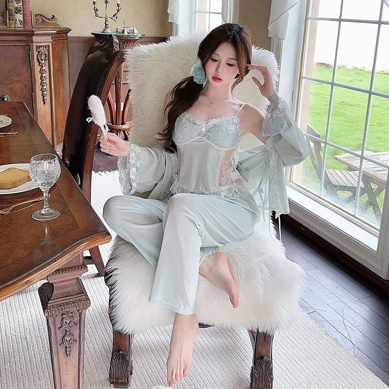 Three piece set of gold velvet pajamas for women in autumn and winter, sexy lace hollow out home clothes for wearing outside, plus size slimming home clothes
